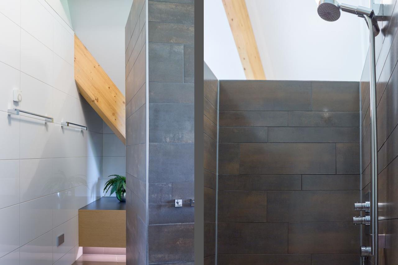 Overloop met toegang tot drie slaapkamers. De badkamer is modern uitgevoerd en voorzien van inloopdouche en wastafelmeubel.
